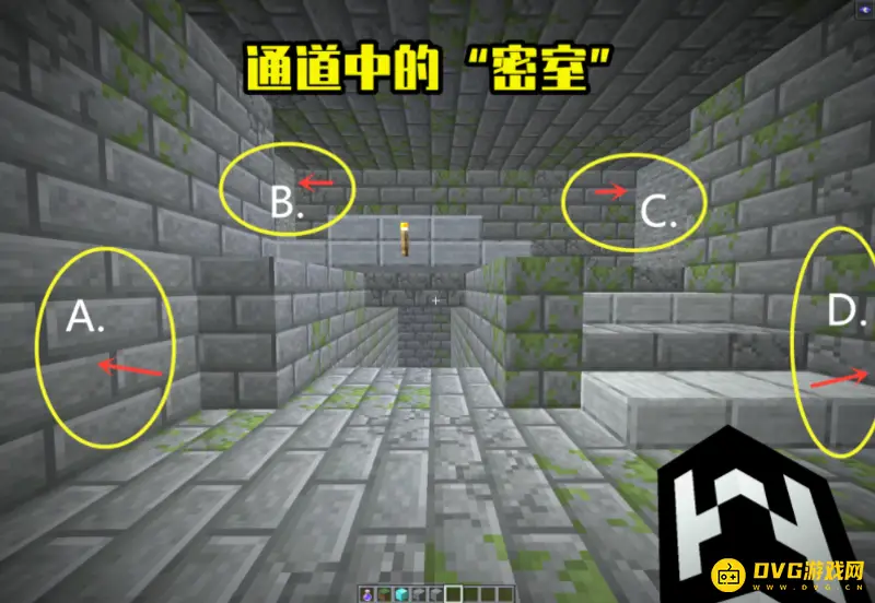 ①其实在要塞之中,除了传送门房间、图书馆、喷泉、监狱牢房等等结构之外还有一个密室。密室所在的位置位于每一个“通道”上方的左右两侧。密室通常位于图中所示的4个位置,这其中有一定的规律,例如如果有一面墙凹陷下去(D点凹陷),那么凹陷同侧的另一个位置(C点)就会出现密室。