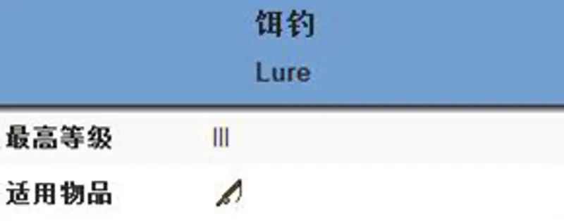 饵钓附魔效果:提高鱼咬钩的速度,每一级降低咬钩等待时间5秒,在VIII级时,鱼钩下水后几乎瞬间就会出现咬钩的颗粒效果,在IX级后,玩家无法钓起任何东西。