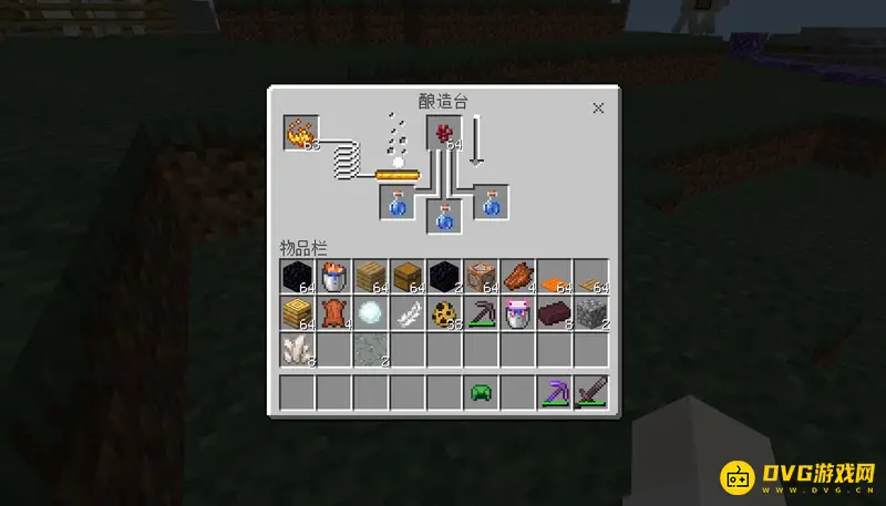 3,接着在左侧放上烈焰粉,下面放三个水瓶,上面放一个下界疣制作粗制的药水。