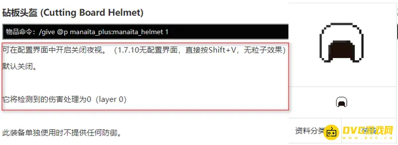 砧板头盔可在配置界面中开启关闭夜视,1.7.10无配置界面,直接按Shift V,无粒子效果,默认关闭。它将检测到的伤害处理为0(layer 0)。