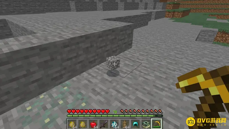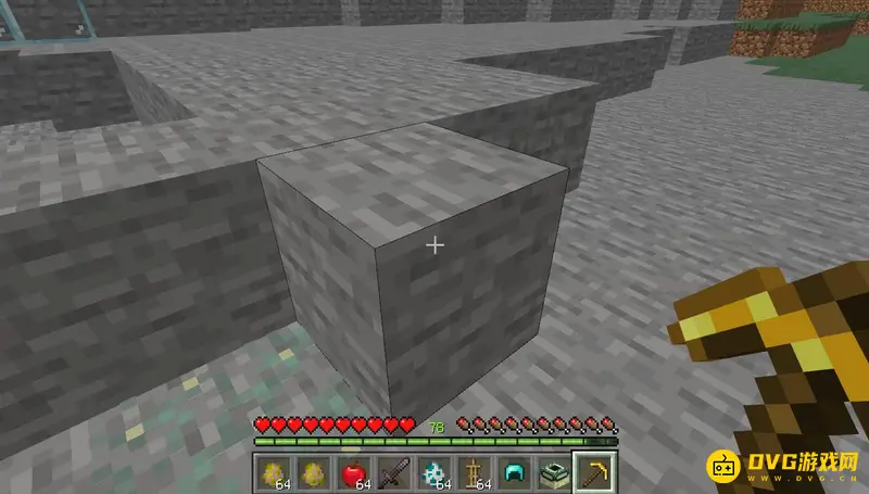 1,例如我们可以拿着金镐左键按住石头不动。
