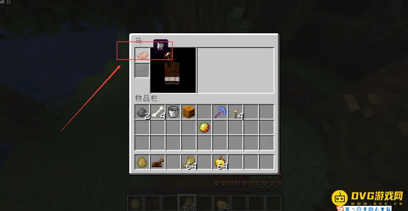 2、这时点击E键,打开马的装备栏,将【鞍】装备到马的第一个格子上,这时就可以前后左右的自由控制马的方向了: