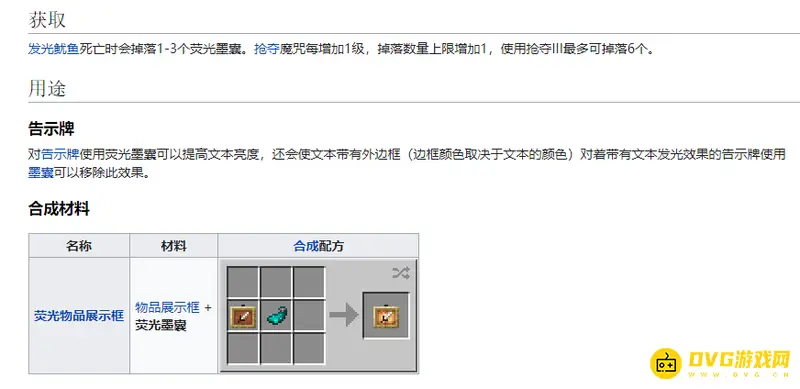 在游戏中,荧光墨囊(Glow Ink Sac)是发光鱿鱼的掉落物,可用于合成荧光物品展示框或增亮告示牌的文本。使用的时候用发光墨囊拿在手上,让后点击一下告示牌,就会使告示牌上的文字发光。