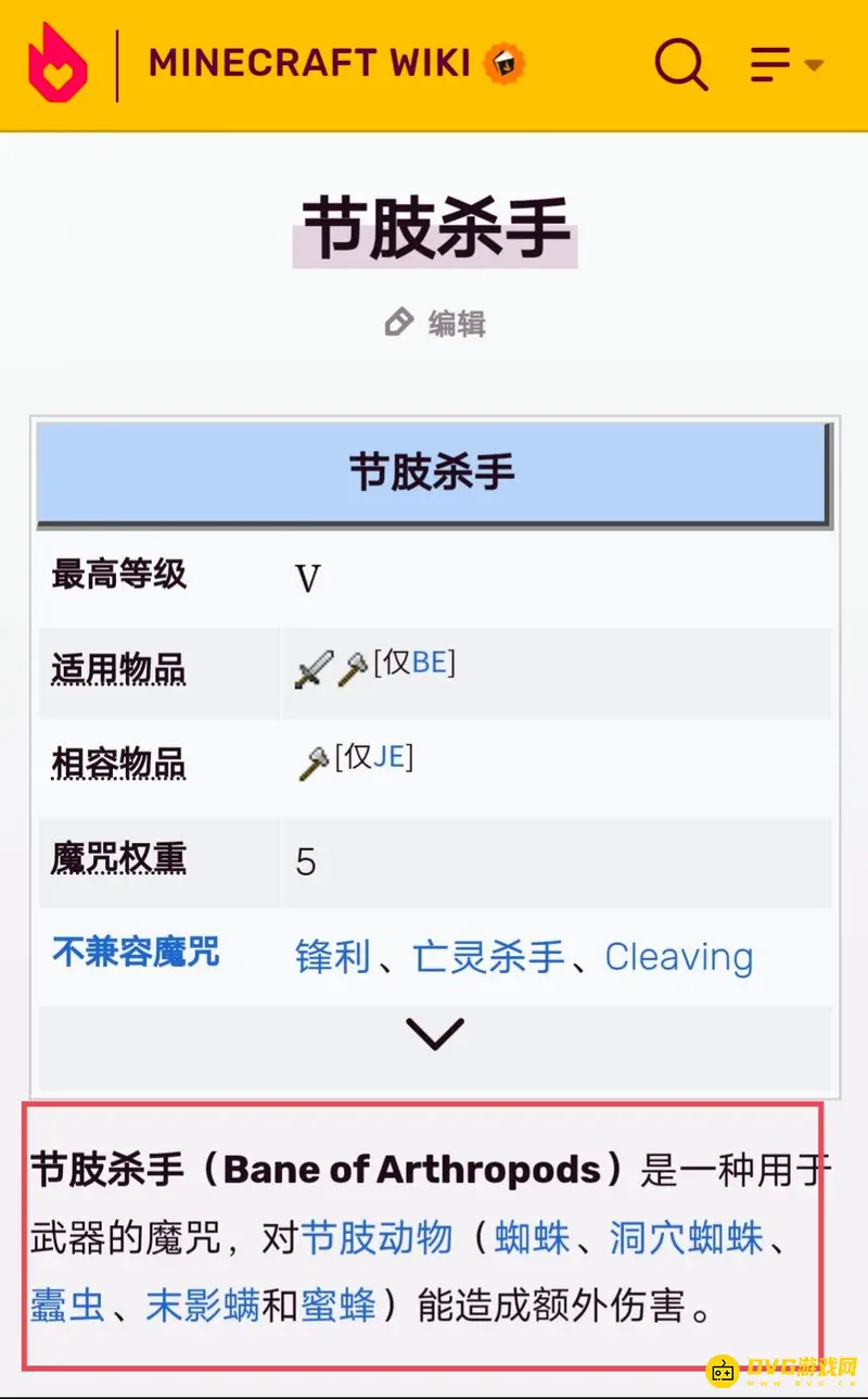 我的世界节肢杀手对节肢生物(如蜘蛛,蠹虫这类的)有额外伤害,截肢克星原名为节肢杀手(中国版为节肢克星),节肢杀手是附魔属性,也就是需要玩家使用节肢杀手附魔书给武器附魔。特别是蜘蛛只有16( Heart (icon).png × 8)的生命值,使用节肢杀手 V可以在攻击冷却结束后一击杀死它们。