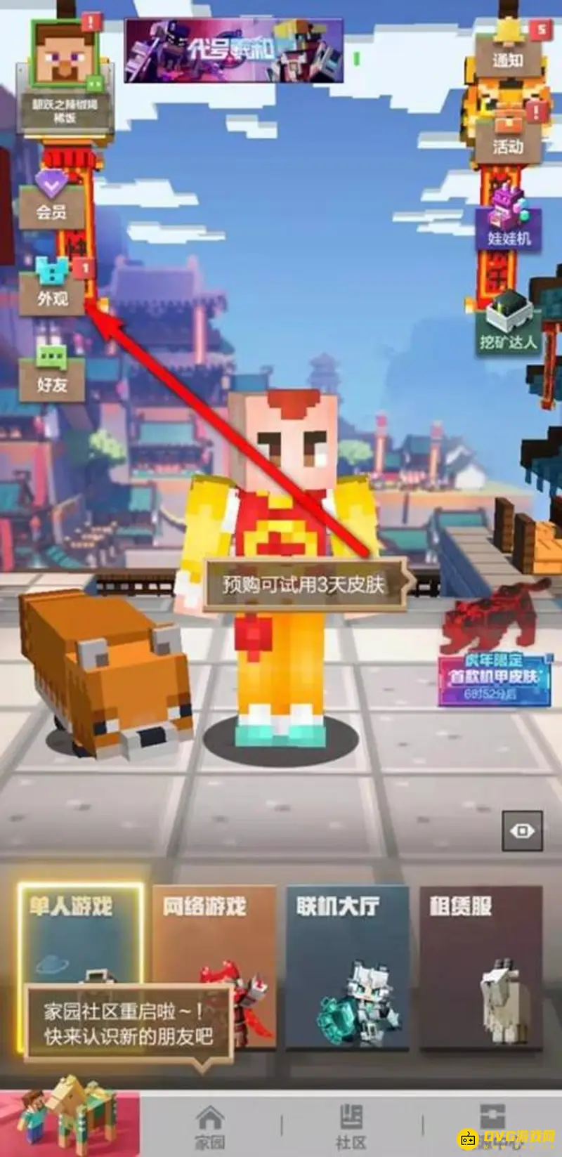 1、在我的世界手游登录界面,点击“外观”