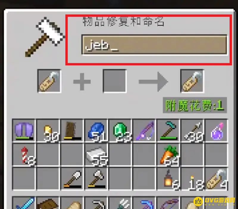 1.点开铁毡,把命名牌放入铁毡中,输入“jeb_”,然后附魔。