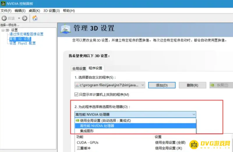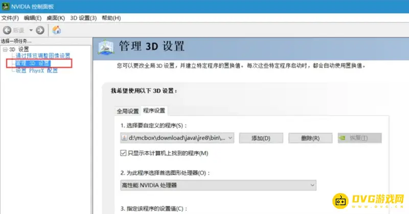 2、找到左侧管理3D设置,选择右边的程序设置。