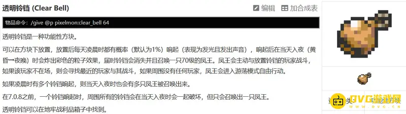 透明铃铛可以在地牢战利品箱子中找到,放置后每天凌晨时都有概率(默认为1%)响起(表现为发光且发出声音),响起后在当天入夜(黄昏→夜晚)时会炸出彩色的粒子效果,届时铃铛会消失并且召唤一只70级的凤王。