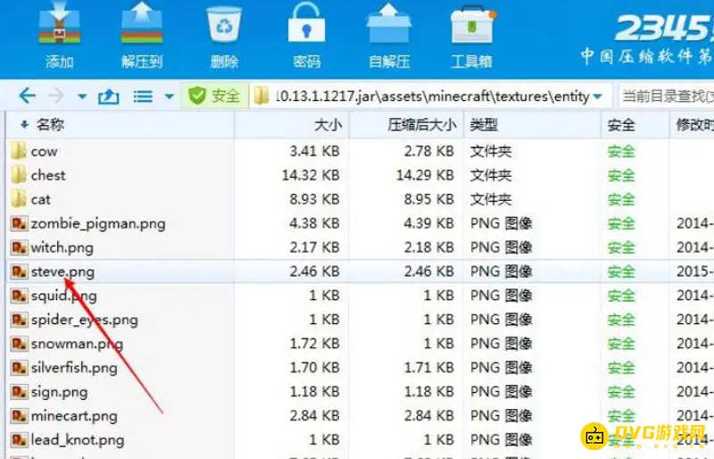 4.打开文件夹后有一个Jar文件,用解压的方式打开它,按照图片来打开文件,接着删除steve文件,然后把刚开始准备好的皮肤文件放到压缩文件里。