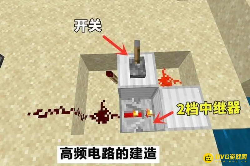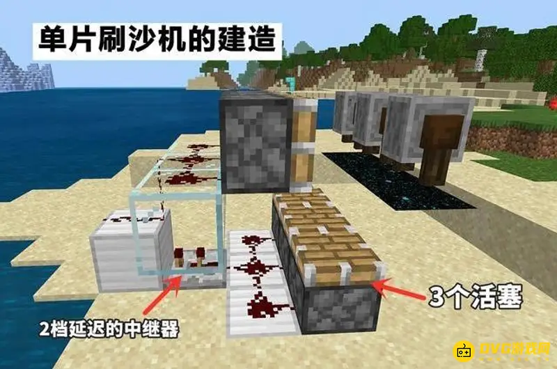 3、高频电路的建造。使用时打开拉杆,机器便会自动工作。从单片刷沙机的结构而言,丝毫没有任何难度可言,更没有涉及到高深的红石知识。唯一可能出错的便是两处中继器延迟档位的设置。