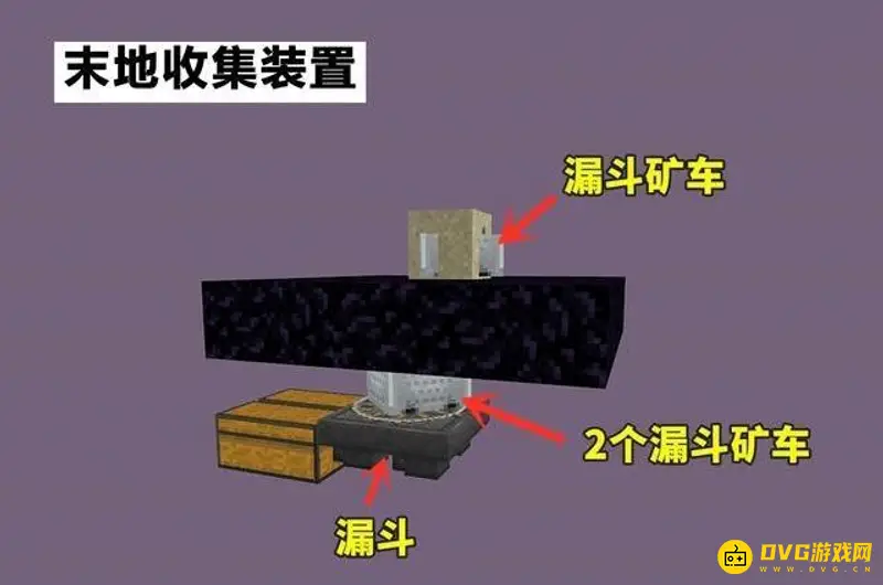 4、收集装置。主世界的刷沙装置完成后,便需要来末地修建收集装置。由于沙子是定点掉落,所以只需要在黑曜石平台下用漏斗矿车收集上方的沙子即可。