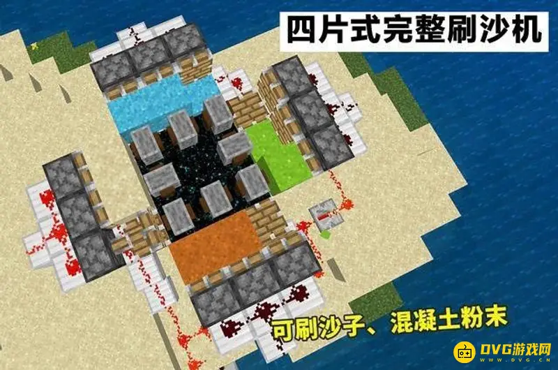 2、单片刷沙机的建造。完整的刷沙机由4个单片刷沙机构成,所以你只需掌握单片的建造方法,再将其复制到其他三个方向即可。