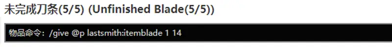 手持未完成的刀条(4/5)右键有水的炼药锅可获得,用于制作优质刀条。玩家也可以使用/give @p lastsmith:itemblade 1 14指令来获得。