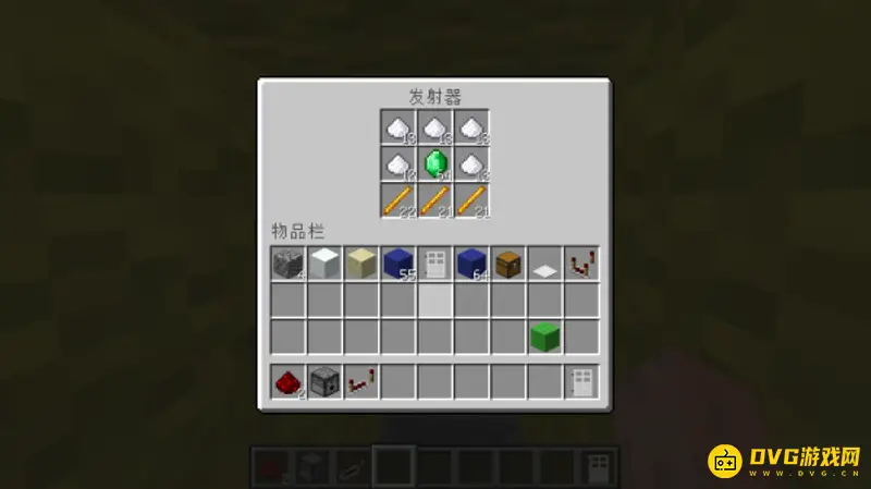 5、往发射器里放奖品,注意物品数量要多,以免太快导致缺货。图中抽奖机抽一次5/9出糖,3/9出烈焰棒,1/9出绿宝石。奖品位置没有要求,如果你想绿宝石多抽出一些,那就把绿宝石放进更多的格子里。