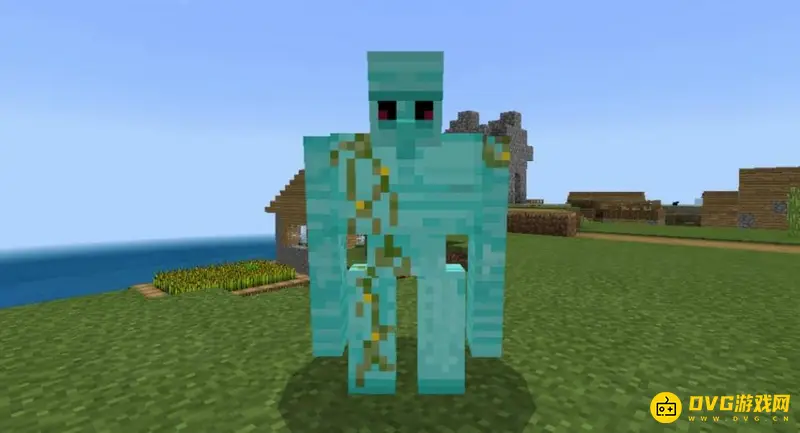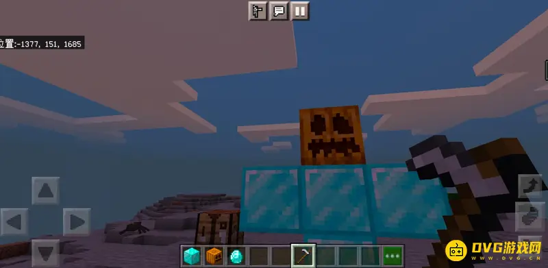 3、将材料准备完毕后,我们将钻石块摆成一个T型,然后在顶上放上南瓜,最后用铁锄点击南瓜,钻石傀儡就做好了。