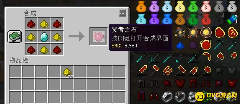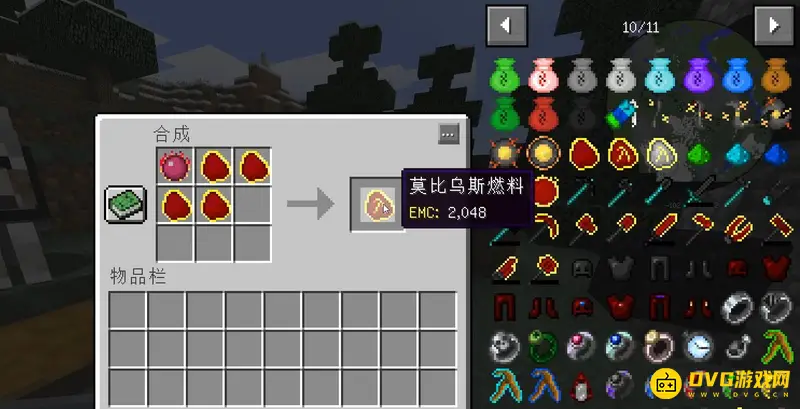 3、最后合成莫比乌斯燃料:莫比乌斯燃料需要通过合成获得,使用1个贤者之石和4个炼金煤炭就能在工作台上合成。