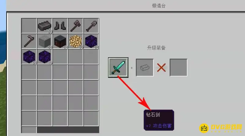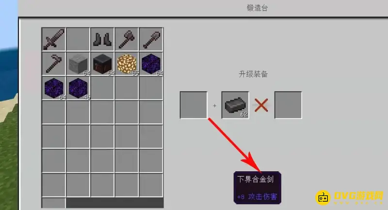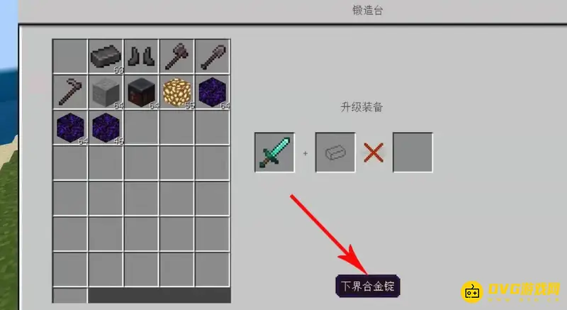 4、使用钻石装备加上下界合金锭即可成功制作下界合金装备,如下图所示。