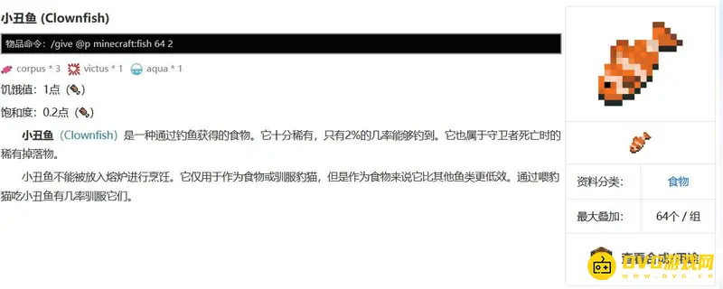 小丑鱼的作用是作为食物或者用来驯服豹猫,一般是用来驯服豹猫的,因为小丑鱼很难得到,并且作为食物它只能增加一点饱食度,这样是非常不划算的,在守卫者死亡后可能掉落小丑鱼。