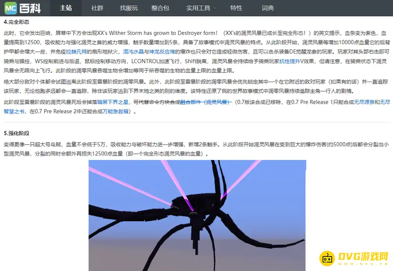 完全形态:此时,它会发出巨响,屏幕中下方会出现XX's Wither Storm has grown to Destroyer form!(XX's的凋灵风暴已成长至完全形态!)的英文提示。