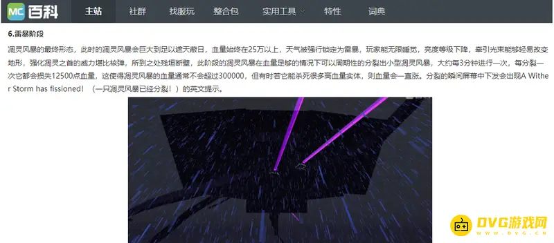 雷暴阶段:凋灵风暴的最终形态,此时的凋灵风暴会巨大到足以遮天蔽日,血量始终在25万以上,天气被强行锁定为雷暴。