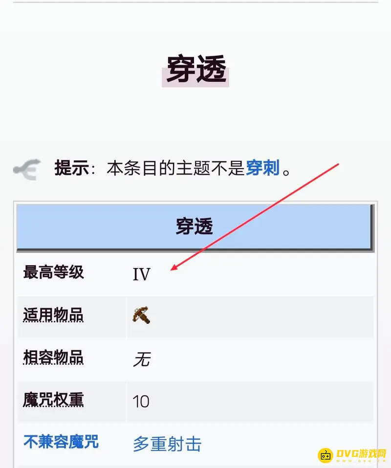 最高等级为4,作用是使箭矢能穿透目标打中多个生物,每提升一级可穿透的怪物增加一,也就是满级穿透可以让一支箭打中五个生物。穿透(Piercing)是一种用于弩的魔咒,可使射出的箭击穿多个实体。