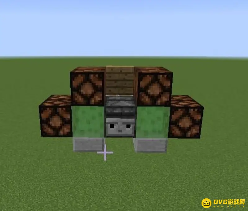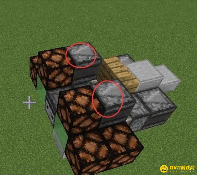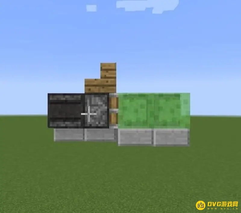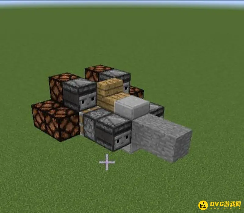 8、作为机头的粘液块前方放两个石头。楼梯前方的粘液块上方放一个半砖。