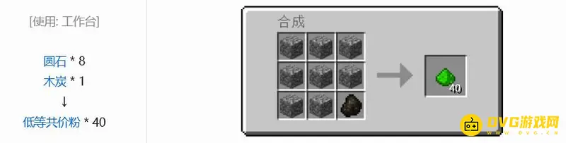 合成低等共价粉需要圆石和木炭, 先用原木烧原木得到木炭,准备1个木炭,8个石头,工作台第一排第二排全放石头,第三排第一个第二个放石头第三个放木炭,就可以合成40个低等共价粉。