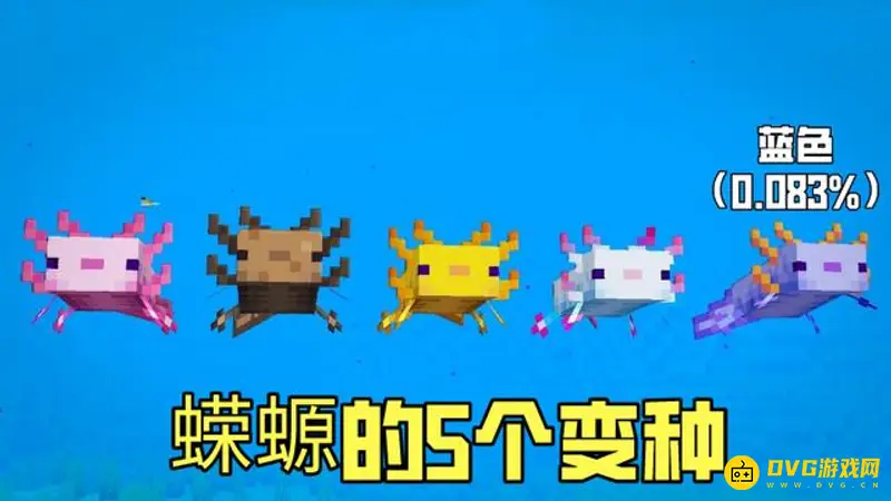 在我的世界里美西螈蓝色的最稀有,因为蓝色美西螈的无法自然生成,只能通过繁殖生成,概率为0.083%,蝾螈一共拥有着5个变种:青色、金色、粉红色、棕色以及蓝色。
