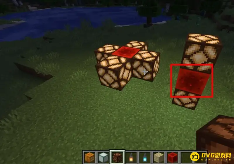 5、挂红石灯的方式:红石灯需要红石电路充能方块才能发光,因此,挂红石灯的时候需要放置红石块供能才能同时挂六个方向。