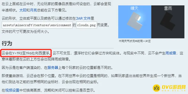 在我的世界这款游戏中,云层出现的最低高度是Y=192。云会在Y=192至196处向西漂浮。云不可交互,漂浮时它们会穿过方块和实体。与现实中不同,云不会产生雨或雪,这意味着即使在云的上方也会出现降雨或降雪。