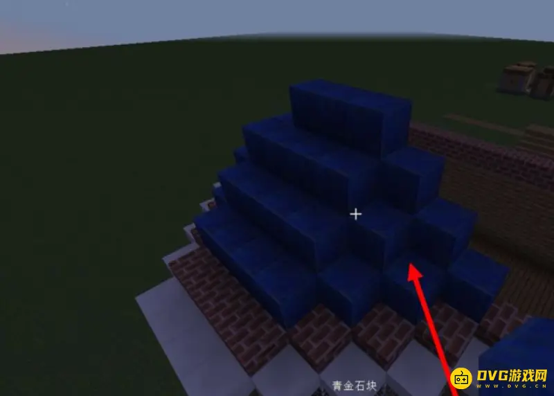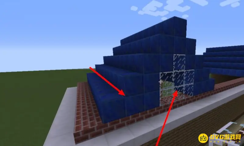 8、下一步就是封顶了,需用不同颜色的方块如青金石块,在两边的窗户顶部做出阶梯样式,向着房子中间递进。