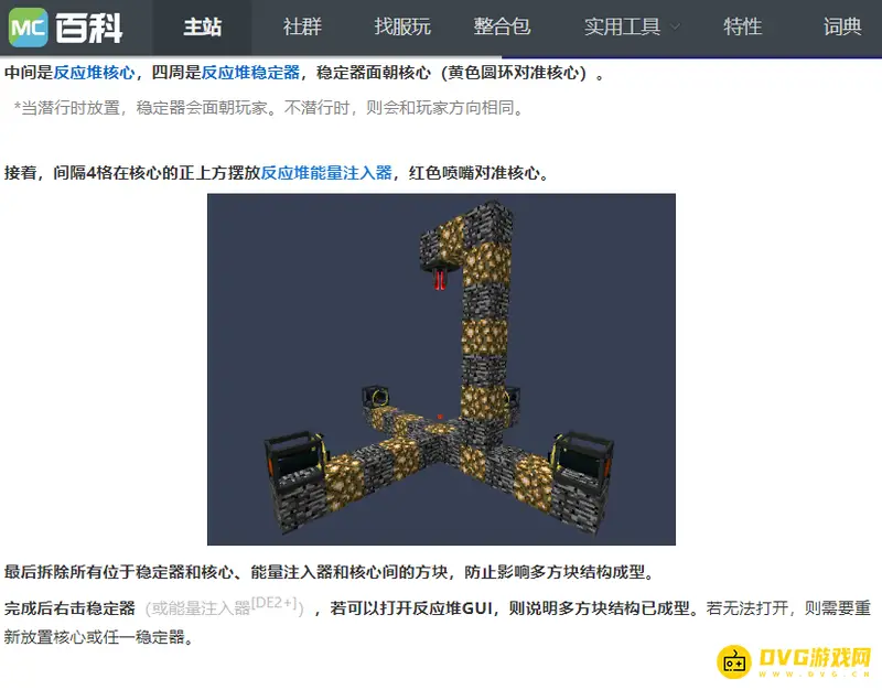 中间是反应堆核心,四周是反应堆稳定器,稳定器面朝核心(黄色圆环对准核心)。间隔4格在核心的正上方摆放反应堆能量注入器,红色喷嘴对准核心。完成后右击稳定器,若可以打开反应堆GUI,则说明多方块结构已成型。