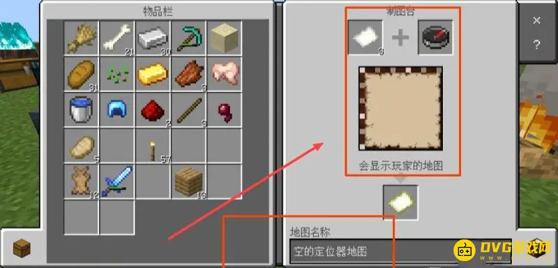 2、进入到制图台中,在右边第一格中放入普通地图,第二个放入指南针,合成空白定位器地图