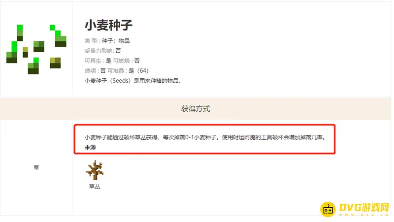 小麦种植对耕地应用小麦种子就可以种植小麦。小麦作物会经历八个生长环节,慢慢发展为可收种的小麦。小麦生长时规定亮度不少于10。小麦种子能通过破坏草丛获得,每次掉落0-1小麦种子。使用时运附魔的工具破坏会增加掉落几率。
