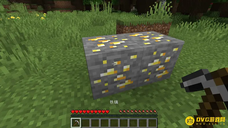 1、进入游戏中,玩家拿出准备好的铁稿,然后对着金矿石点击鼠标左键进行挖取。