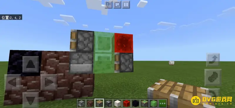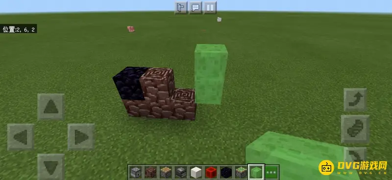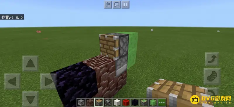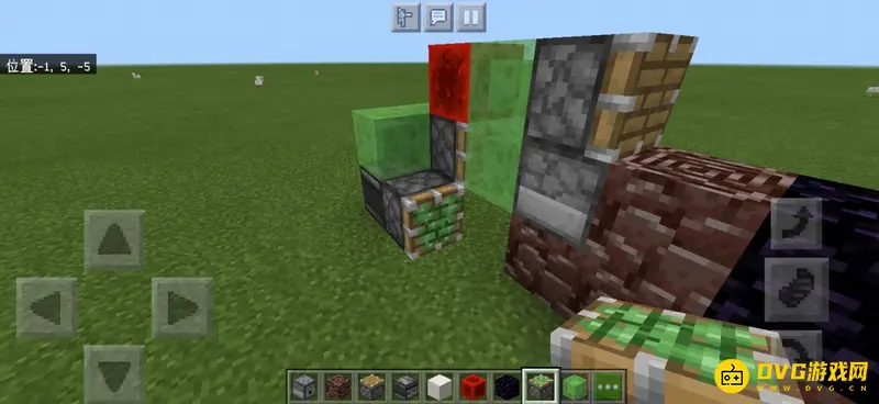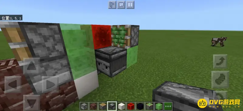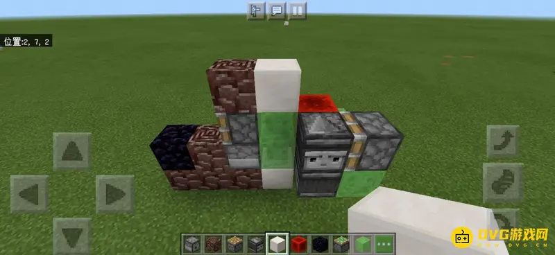 2、左边放置一个黑曜石卡住机器,因为后面会加活塞虫,防止机器跑掉。右边放置两个粘液块,可以先在地上放一个,在上面放置两个,再把下面的一个挖掉。