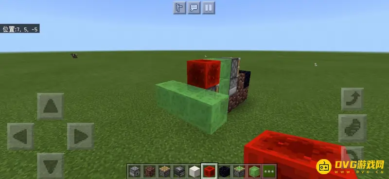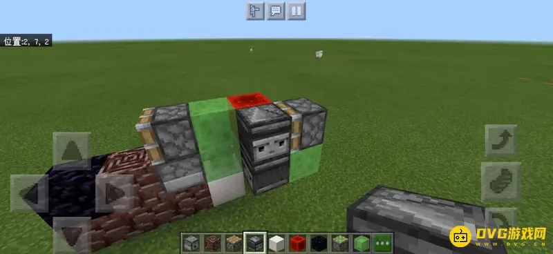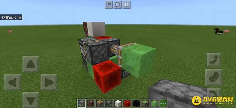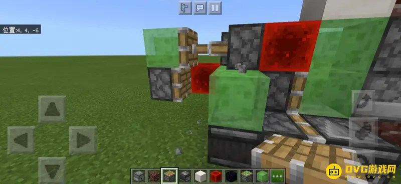 10、从机器的后面看,左边的粘液块后面放置一个红石块,中间的红石块后面放置一个粘液活塞,活塞前放置一个粘液块。