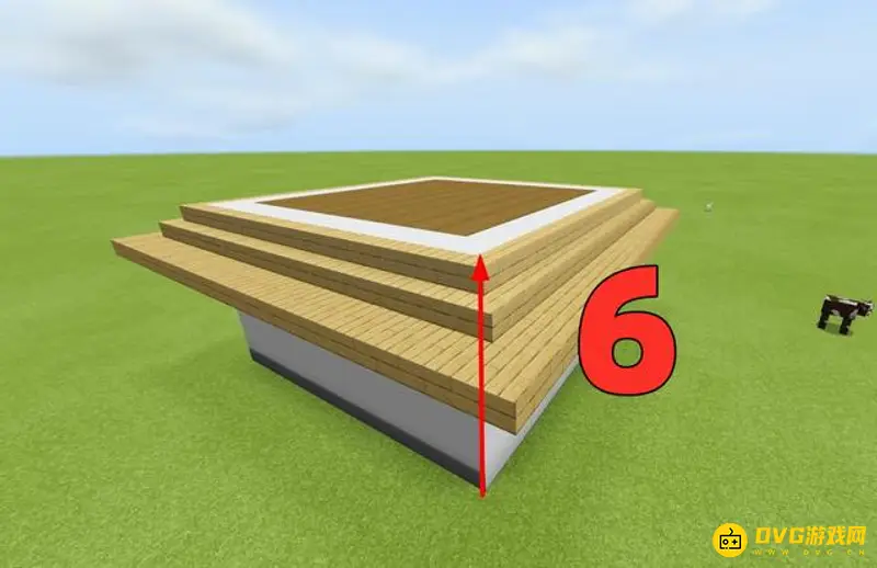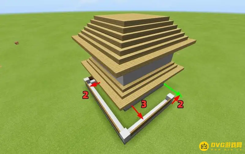 2、同样的方式把地基搭建成6格高,用橡木台阶搭建一圈,楼梯下面继续搭建橡木半砖,也是一圈。