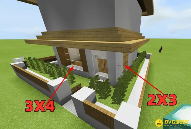 6、门口用白色阶梯,前门窗口3X4,两边用去皮方块装饰,而在侧面我们建造一个2X3的小窗户,用云杉木活力板门建造。