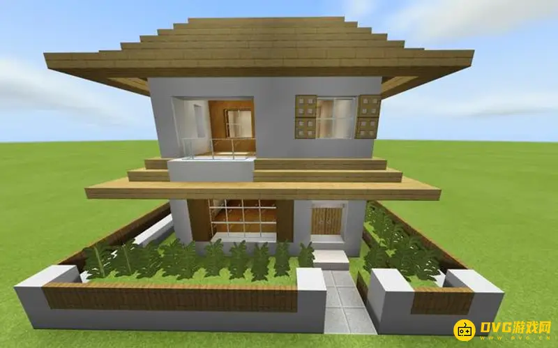 7、二楼建造一个小阳台,用玻璃当作栅栏围起来。二楼的窗户是2X2,用玻璃搭建起来,在窗户两边安装好橡木活力板门。日式樱花别墅建造完成。
