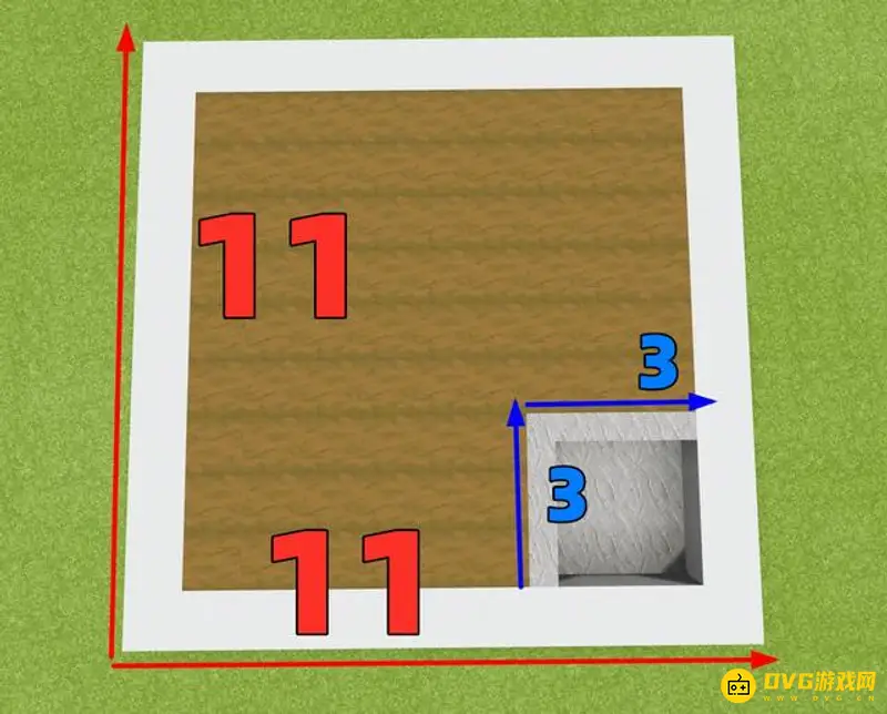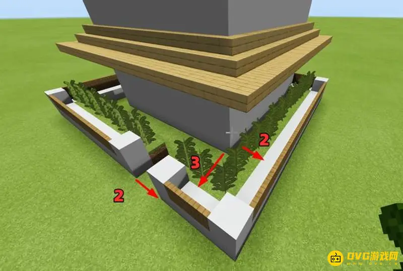 1、首先我们用白色混凝土或者石英方块搭建一个11X11的地基,任意一个角挖一个3X3的坑做门,外围用安山岩阶梯搭建起来。