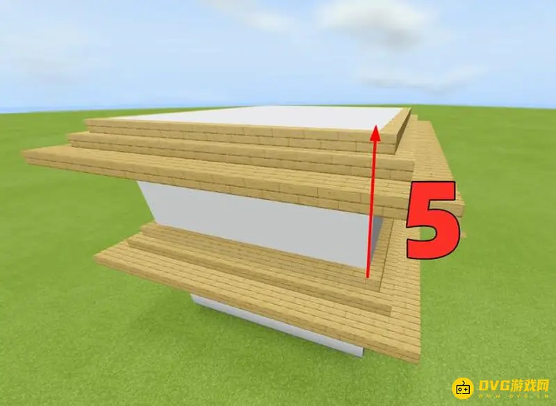 3、继续搭建5层高的白色墙体,这里是二楼,而墙体周围的继续用橡木阶梯搭建一圈,再用橡木半砖搭建一圈。