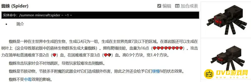 蜘蛛的英文是Spider,蜘蛛是一种在主世界中生成的生物,生成以4只为一组,生成在主世界亮度7及以下的区域。在基岩版还可以生成在树叶上(这会导致基岩版中的森林生物群系生成大量蜘蛛)。蜘蛛攻击玩家时会不时地跳跃,导致玩家较难攻击到蜘蛛。