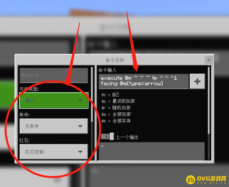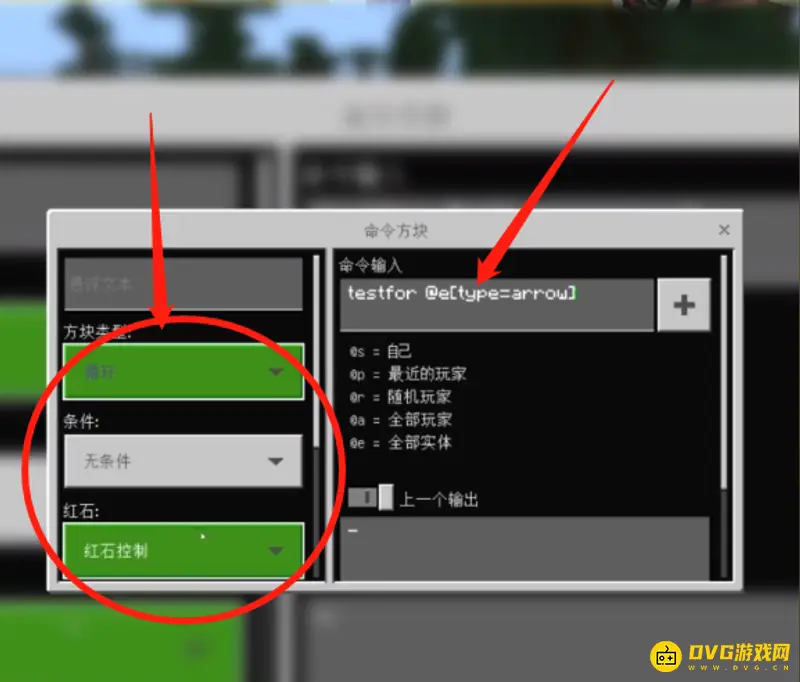 2.testfor @e[type=arrow],方块类型选择:循环 无条件 红石控制;