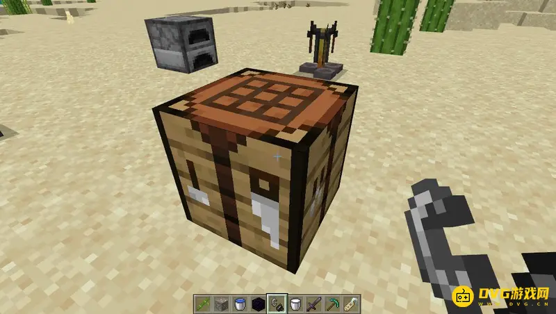 1,线可以用于合成羊毛、弓、钓鱼竿和拴绳,例如我们想用线合成弓,首先我们需要找到工作台,点击鼠标右键进入工作台界面。