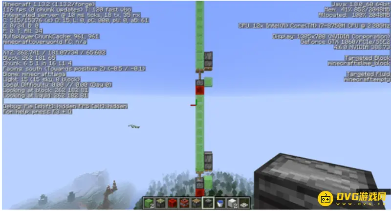 11、如图,我打掉下面的红石块,这个飞行器就会向上飞,现在我们要给他做一个触壁返回的装置我们来观察他触壁的前1TICK的表现