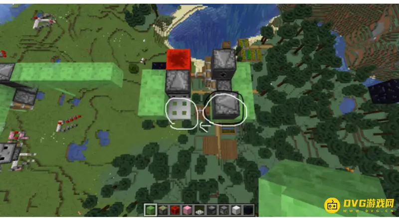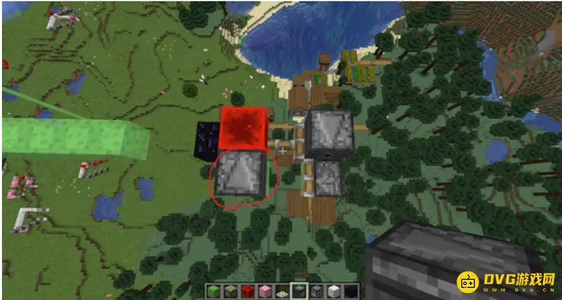 5、TNT飞行器到另一边的时候,我们用红石+活塞这样的组合来阻挡那个铁块部分,就像这样