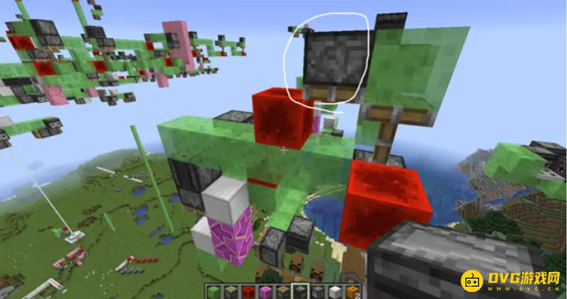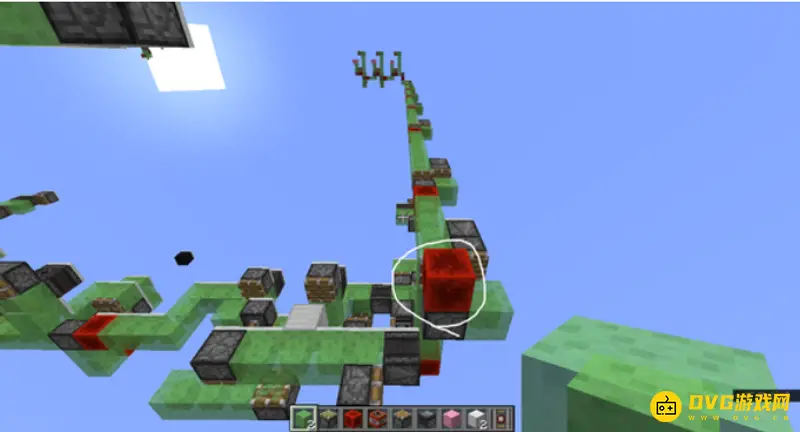 3、最后,我们把TNT复制机的总开关红石与零延时框架相连,这样,我们只需要敲掉最下面的红石块如图