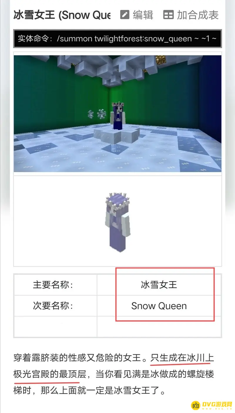 我的世界暮色森林冰雪女王在极光宫殿,到达极光塔顶层即可看到BOSS冰雪女皇,使用弓箭和剑可以对冰雪女皇造成伤害。这个生物有着异常漂亮的外观,她身穿雪白长裙,头戴冰雪王冠,唯一美中不足的就是她的眼睛看起来有些诡异。