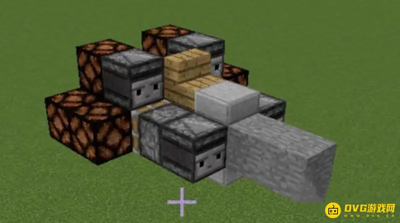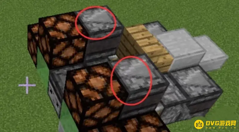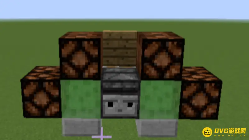 8.第8步:在位于机头上的粘液块前放置两块石头,并在这个粘液块的上面放一块半砖。